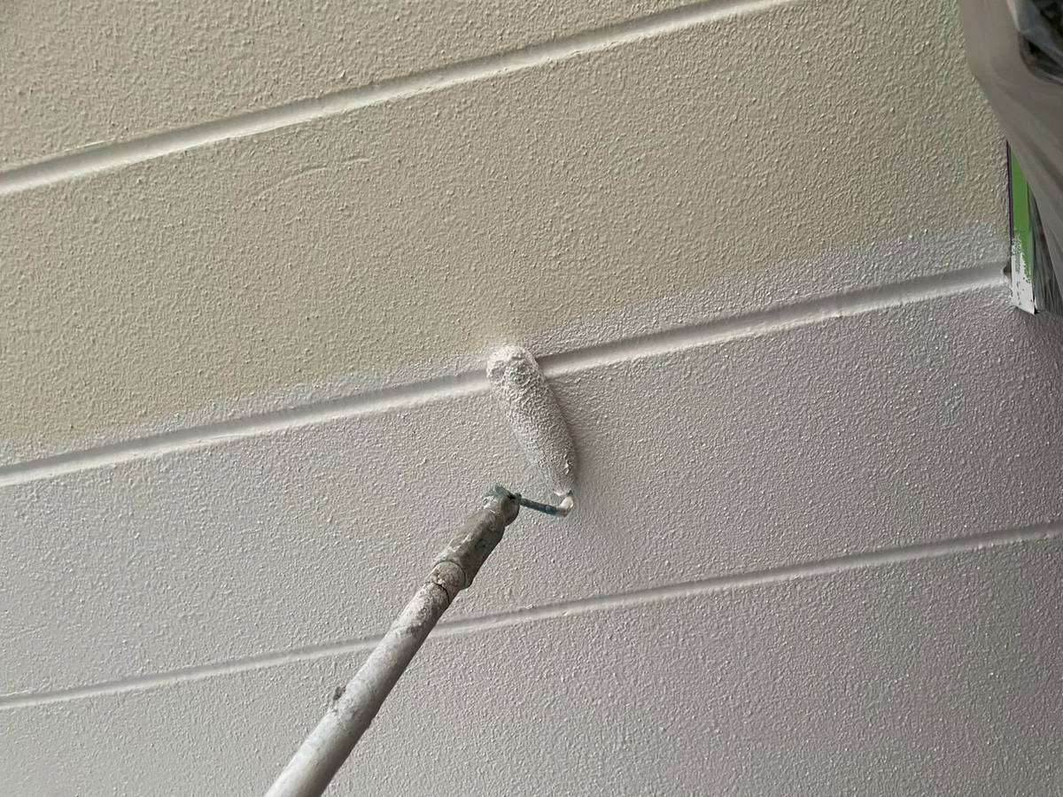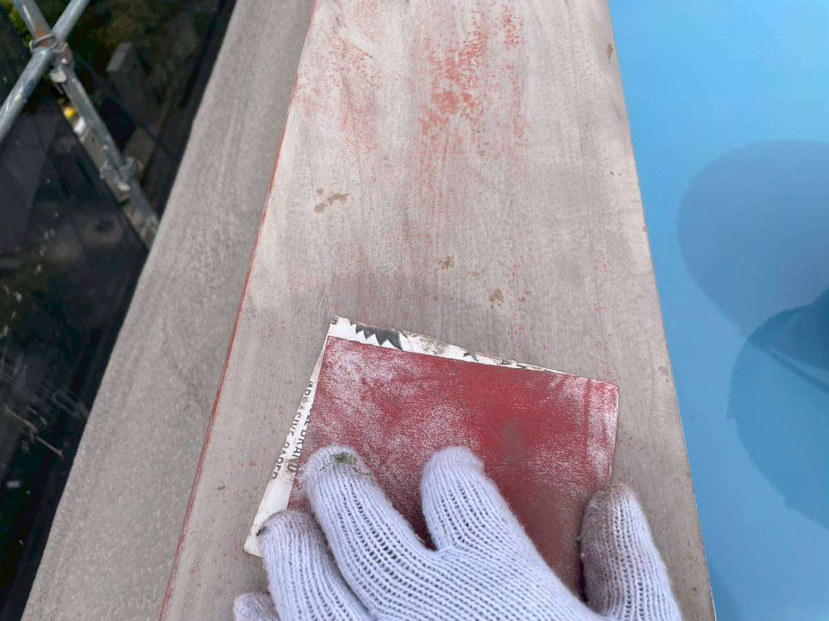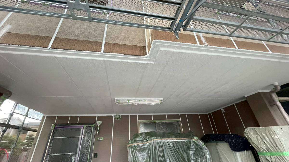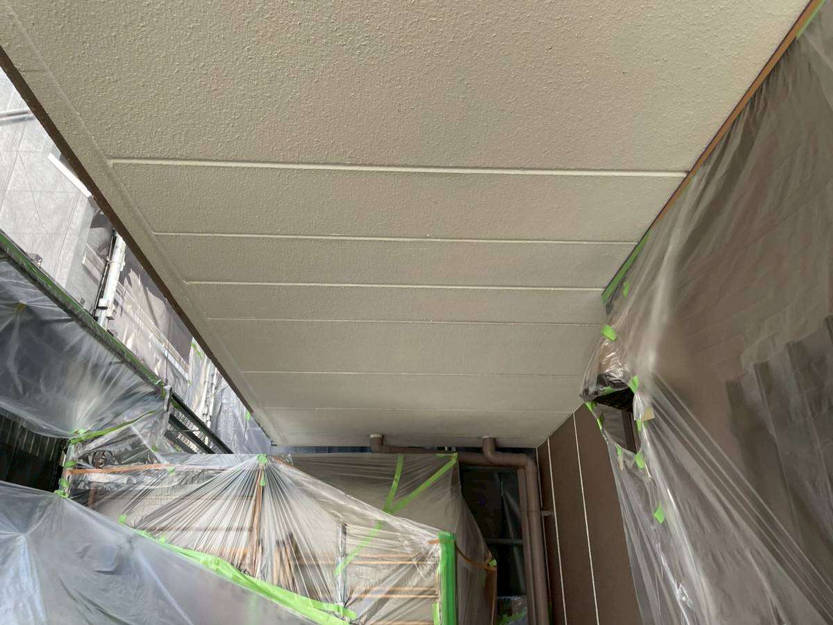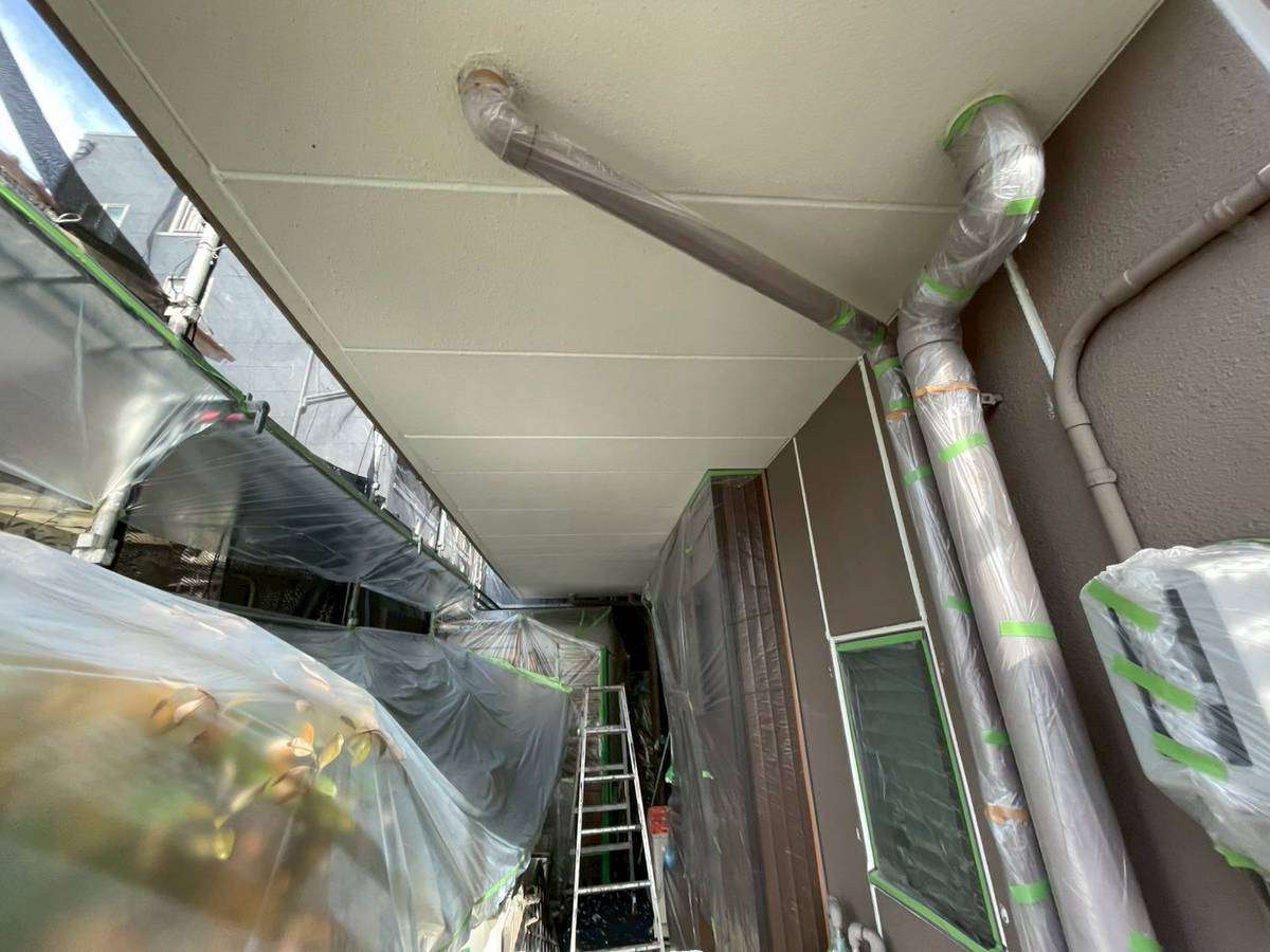 K様邸の作業は、屋上の笠木部のケレン・錆止め塗装と養生、軒天の1回目塗装、屋上通気緩衝工法防水のトップコート塗装作業を行っていました。