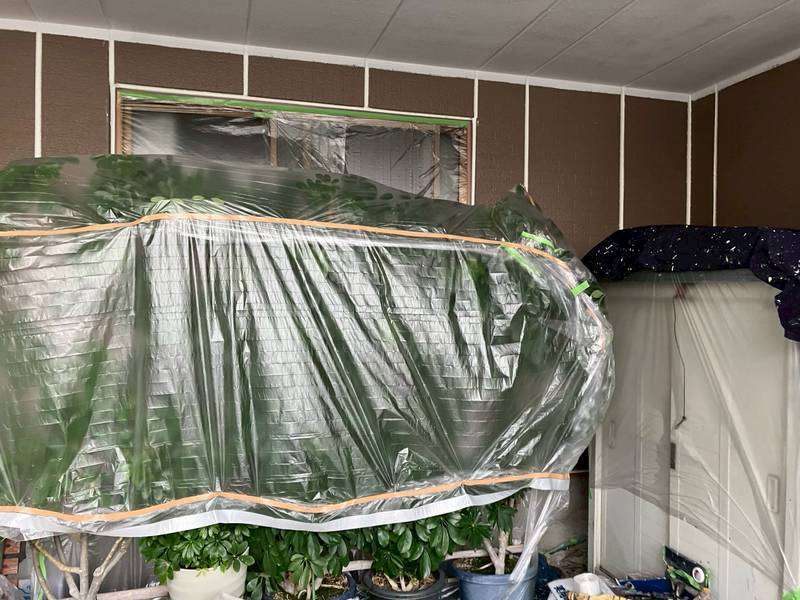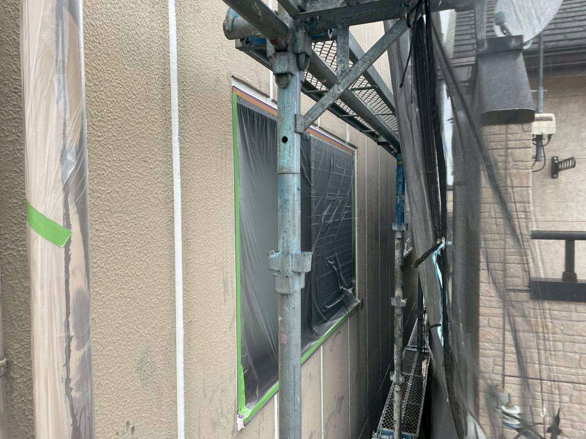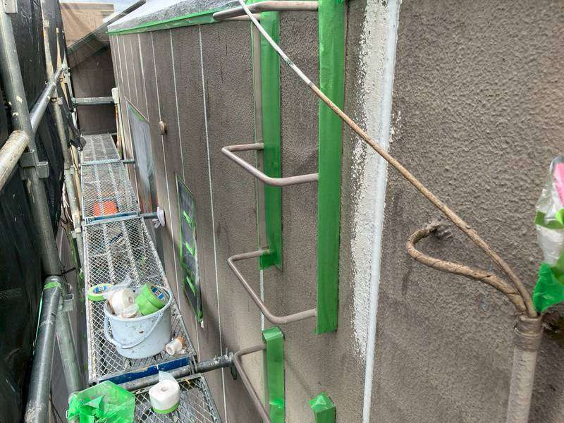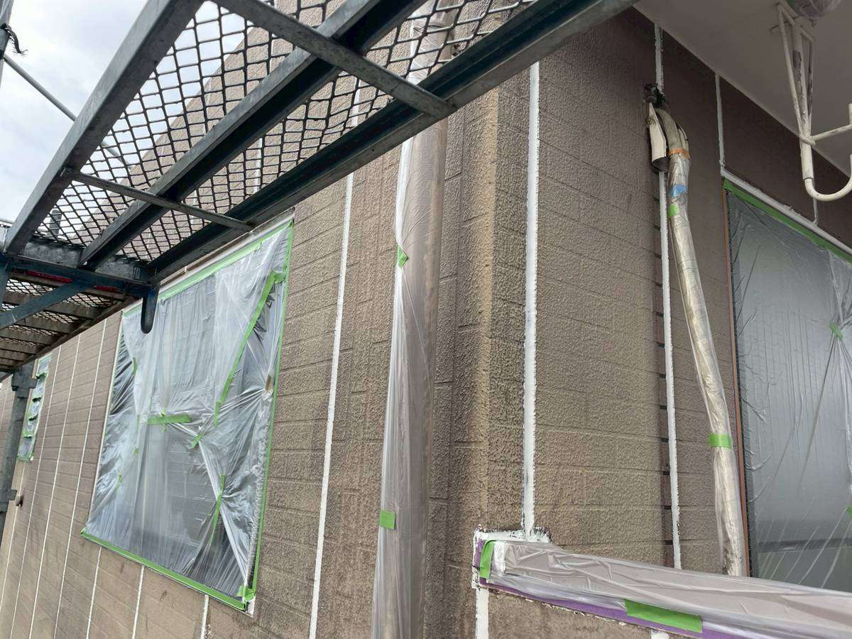 今日の作業は、外壁の下塗り塗装作業を予定しています。