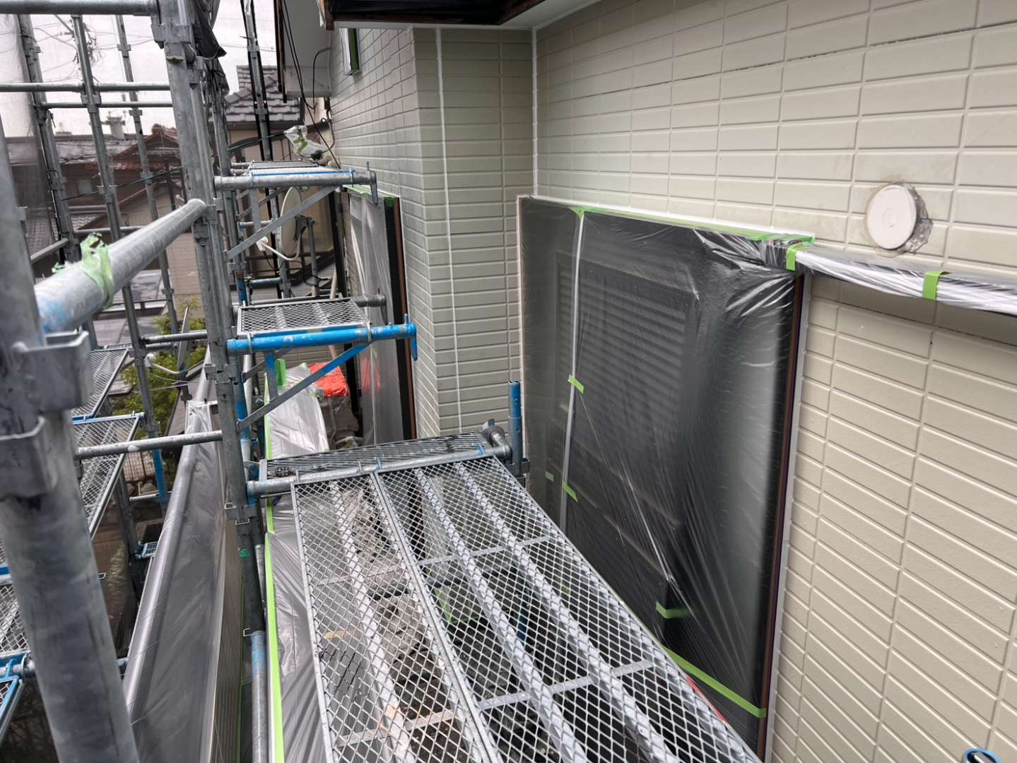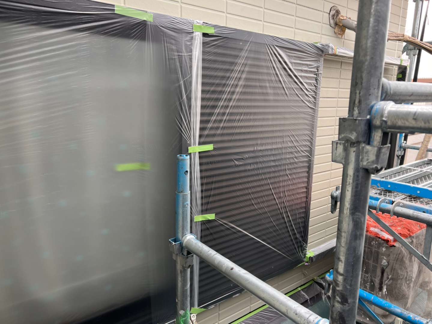 犬山市F様邸の昨日の作業は、非塗装部分の養生作業、屋根板金部のケレンサビ止め塗装、屋根下塗り塗装、玄関周りの塗装作業を行っています。