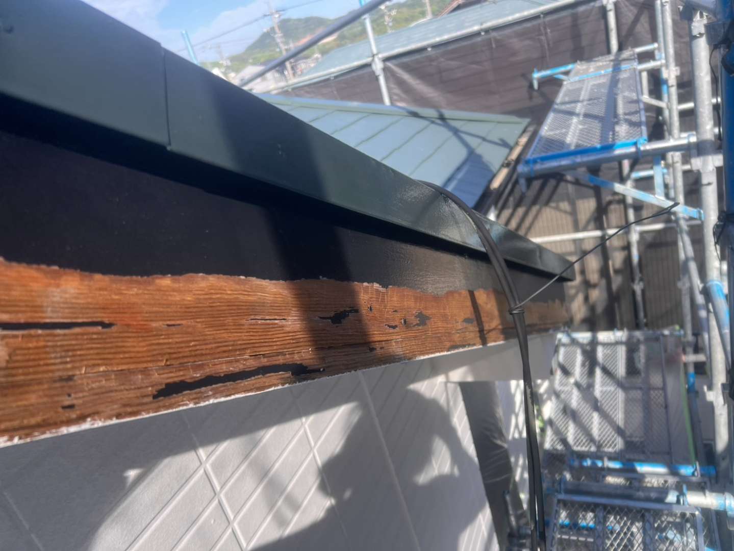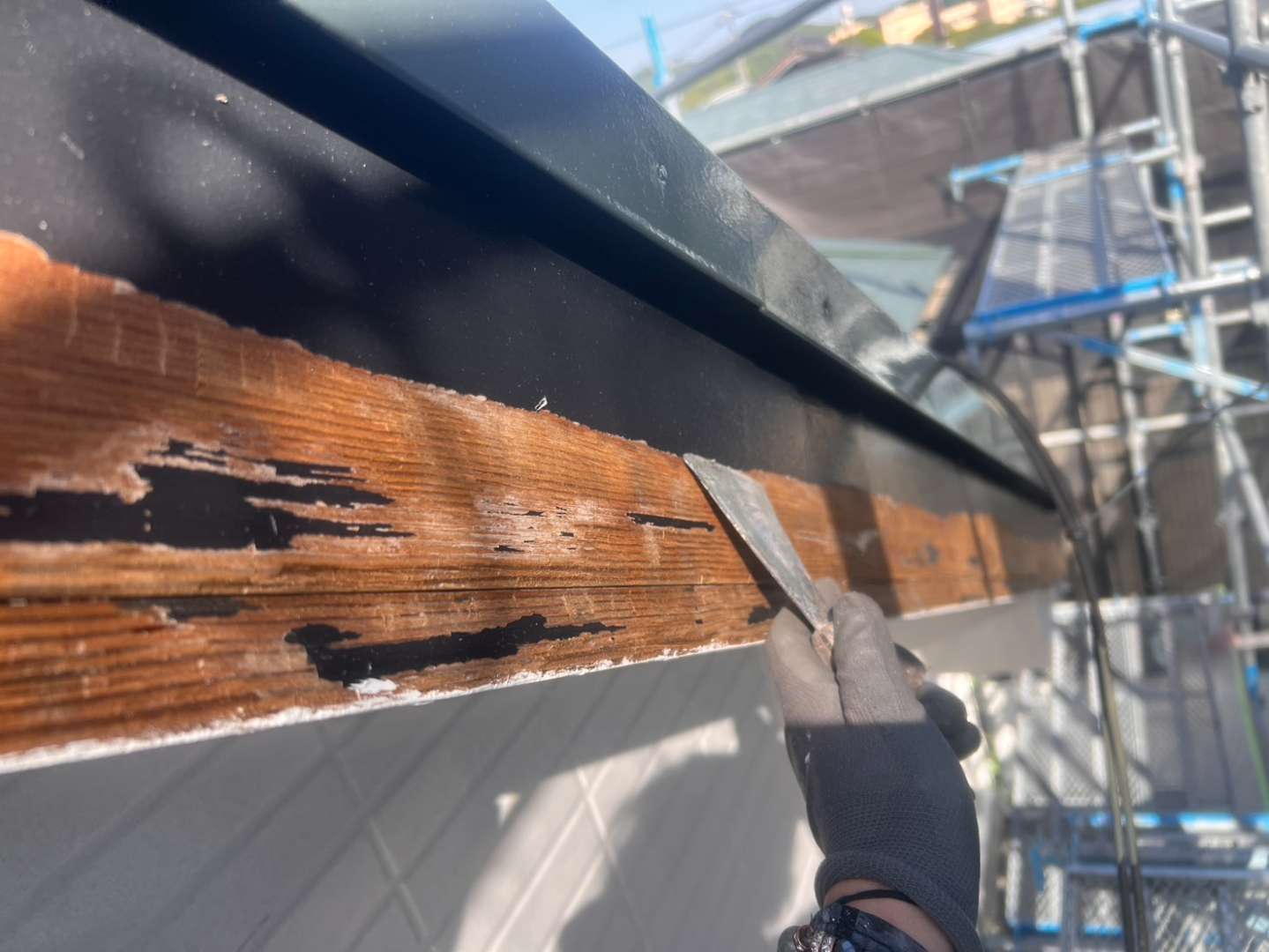 犬山市のF様邸の昨日の作業は、外壁の下塗り塗装作業と破風板の劣化部分のケレン作業を行っています。