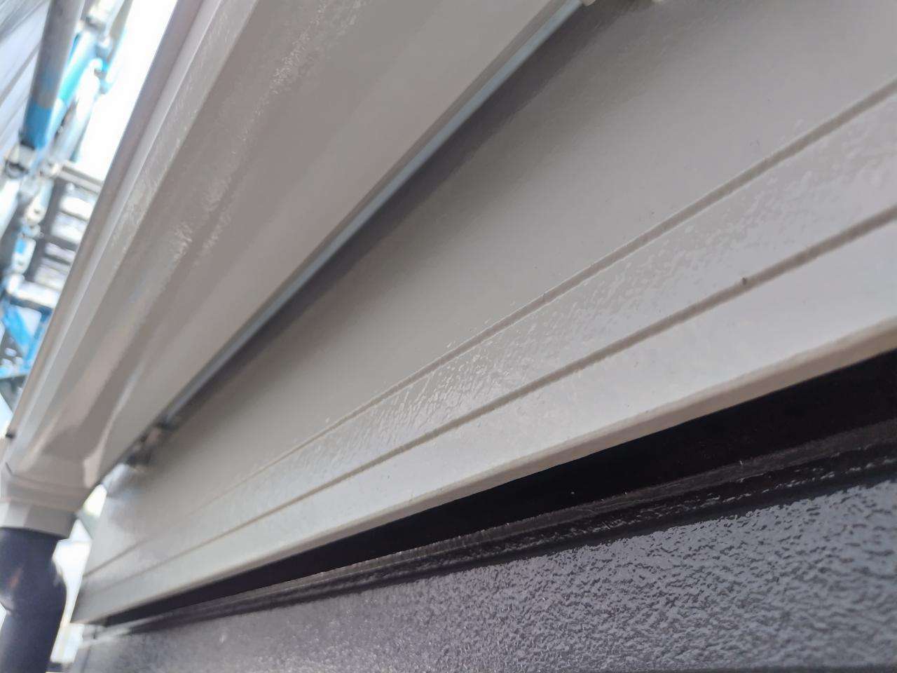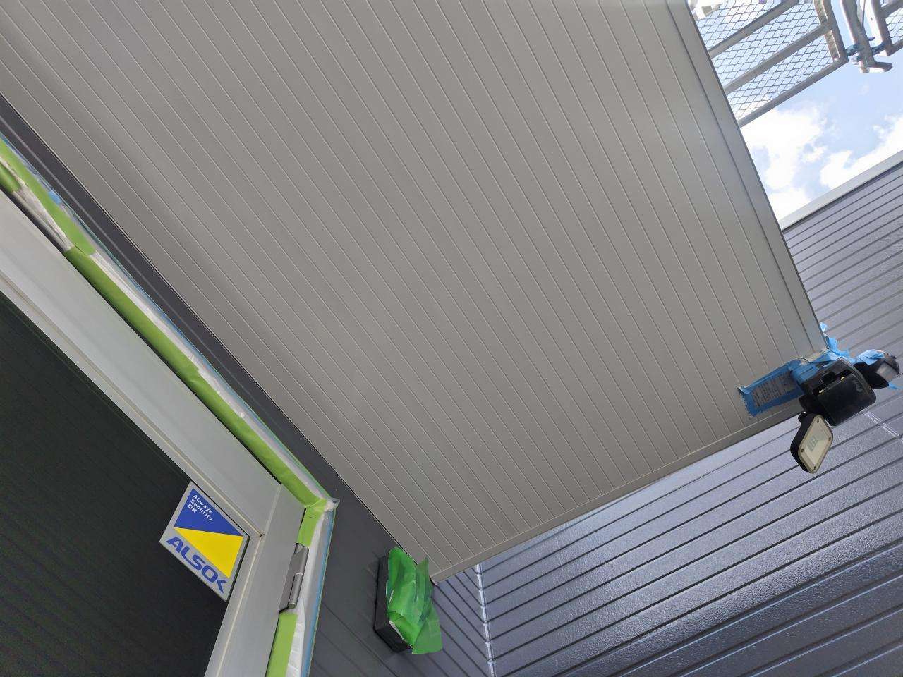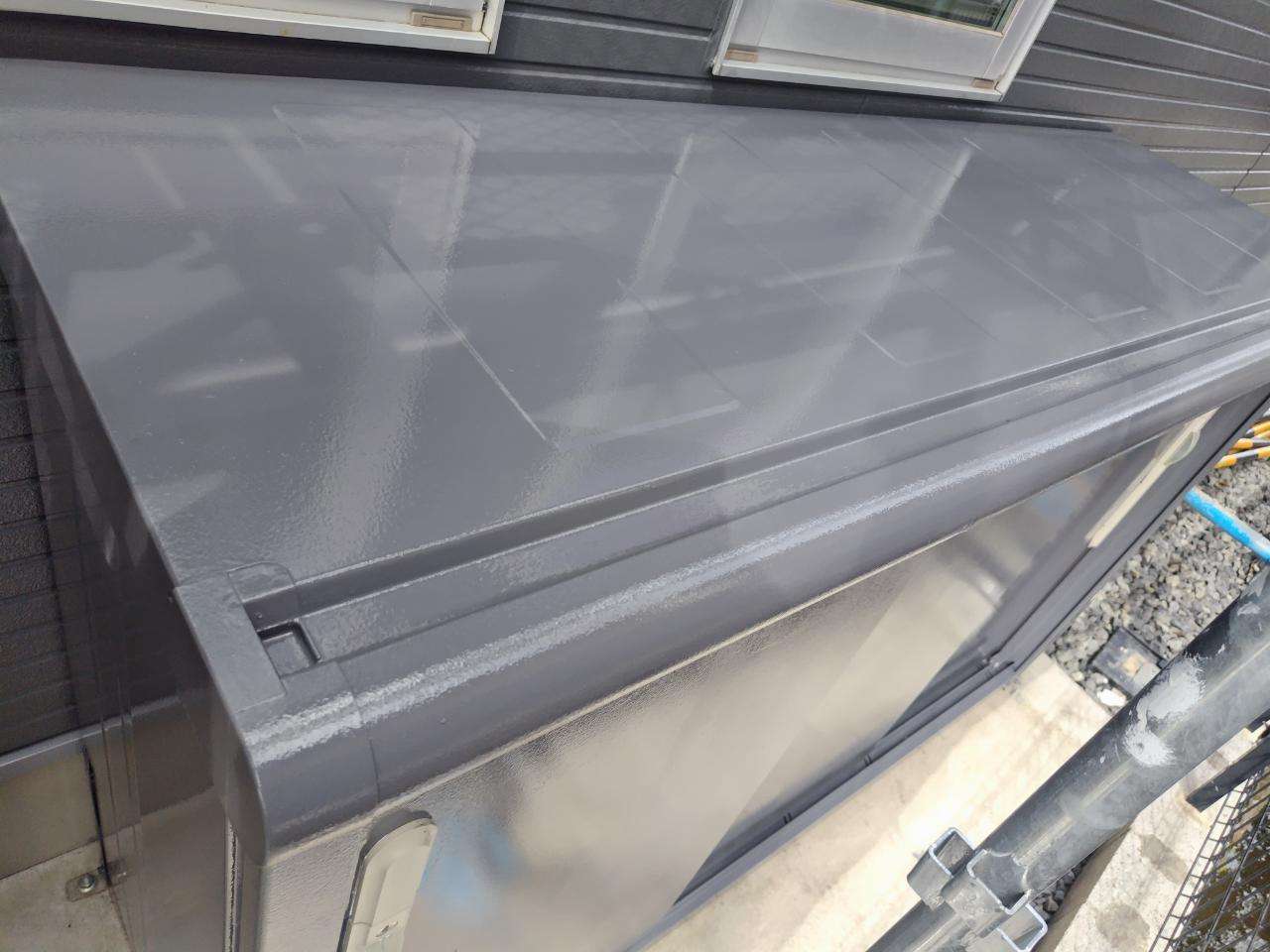 T様邸の昨日の作業内容は、付帯部塗装作業の鼻隠し板・軒樋シャッターボックス・庇・水切りの上塗り2回目塗装、倉庫の上塗り1回目・2回目塗装、エアコン配管カバーと縦樋の上塗り1回目・2回目塗装作業を行っていました。