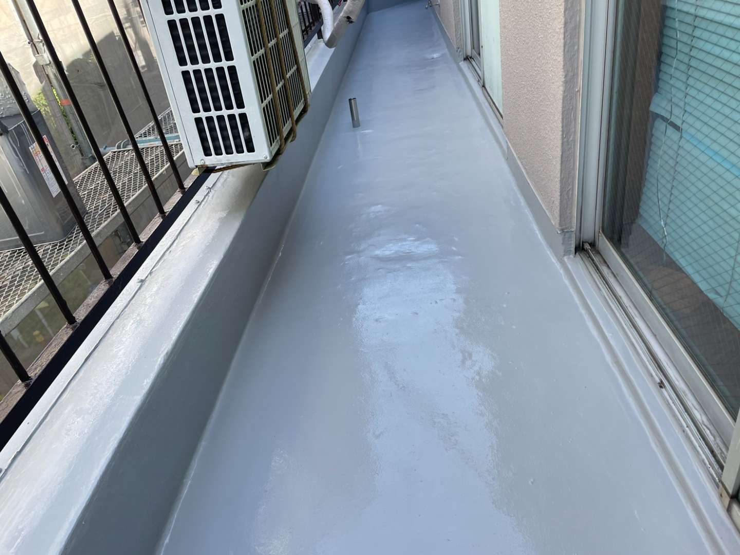 外壁塗装・ベランダFRP防水工事を行いました。 カラーシミュレーションを利用して配色しています。 エアコン配管カバーを外してから、施工して…
